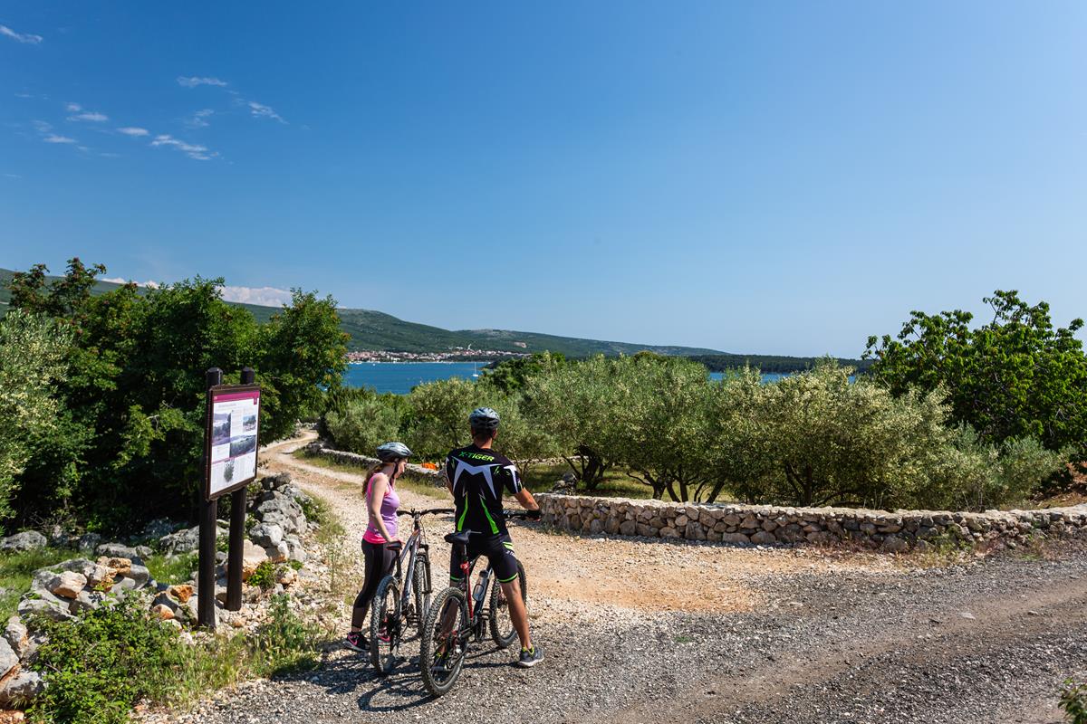 The unique combination of education and recreation will attract all cyclists who dare to take a ride through the northern hinterland of the city of Krk. This less demanding MTB trail starts in Krk, and for the most part, follows the educational trail. Following the Paths of the Golden Drops of Krk's Treasure, marked with information boards and dedicated to olives, olive growing on the island and olive oil. Heading eastbound from Mate Balota Street towards Kornić, cyclists can immediately start learning after coming across the first boards in the lower part of the route. They describe a misshapen and knobbly branched tree with oval leaves and oval fruit, whose colour ranges from dark green to black. This is, of course, the olive tree, which for centuries has been one of the most important crops in this region. Olives are used to produce a nutritionally invaluable oil rich in antioxidants and vitamins, which is used for food and medical purposes. The Roman travel writer Apicius established that Krk extra virgin olive oil was among the finest in the world 2000 years ago when he called the Liburnian oil exemplary of the Mediterranean. The secret to its excellence undoubtedly lies in the indigenous varieties, as well as the geographical location of the northernmost island of the Mediterranean, which greatly benefits from the Continental-Mediterranean climate.